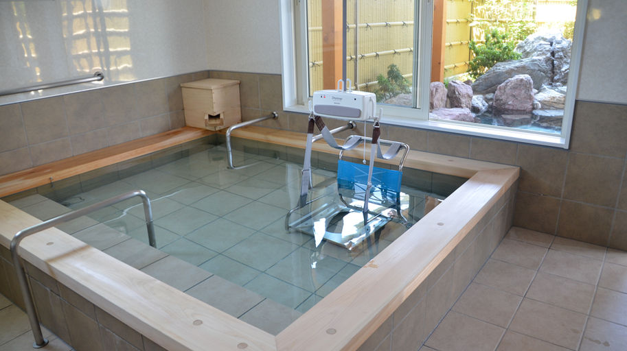 車いすの方でも楽々入浴できるリフトを常設し、檜が香る内湯はもちろん、広々とした露天風呂もご利用いただけます。